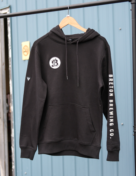 Men's classic hoodie with 'B' logo patch on front chest and Breton Brewing text on sleeve.